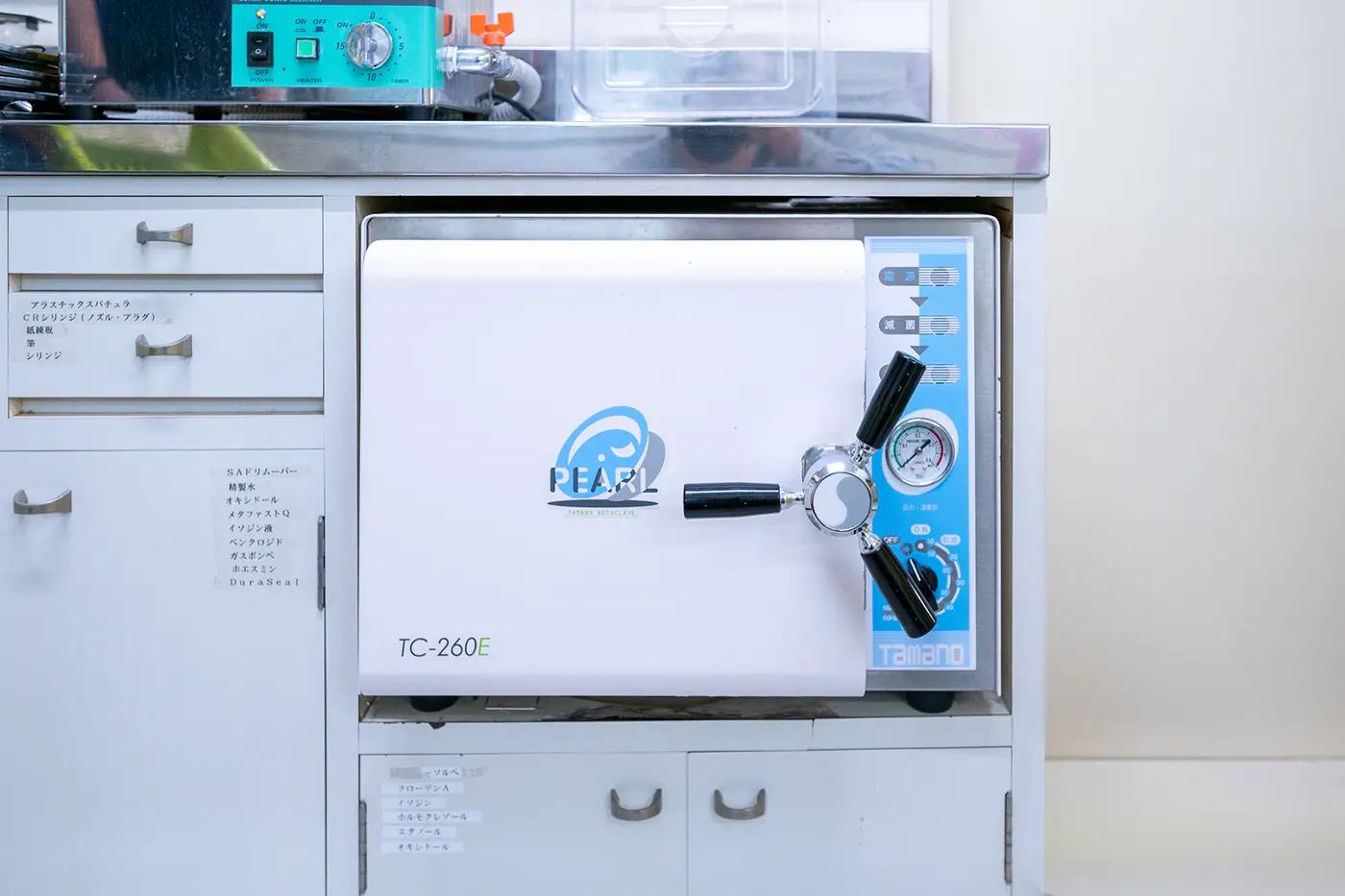 当院では手袋やコップ、エプロンまで、可能な限りディスポーサブル(使い捨て)を徹底しています。また、高圧蒸気滅菌器で滅菌処理を行っておりますので、小さなお子さまからご高齢の方まで安心して治療を受けていただけます。