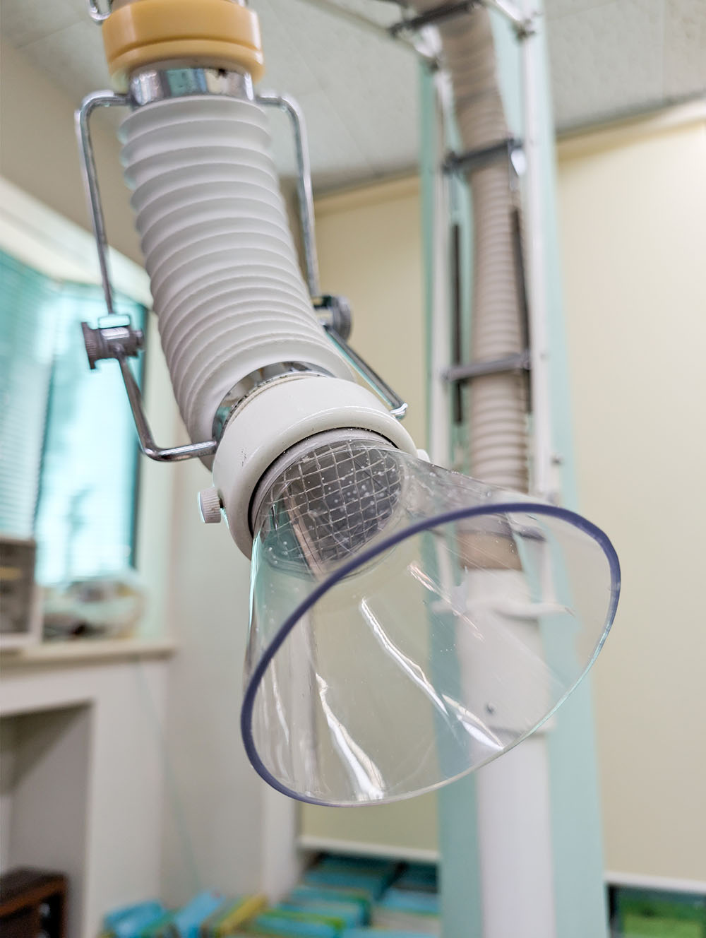 口腔外バキュームは、治療中に発生する微細な水や唾液、切削粉塵、においなどを吸引する装置です。特にエアロゾルには患者の血液や微生物、病原菌が含まれており、院内感染のリスクを高めます。厚生労働省の調査によると、口腔外バキュームを使用することで、細菌の検出が約9 割減少するとのことです。